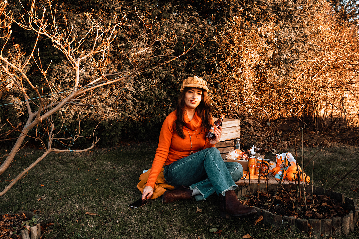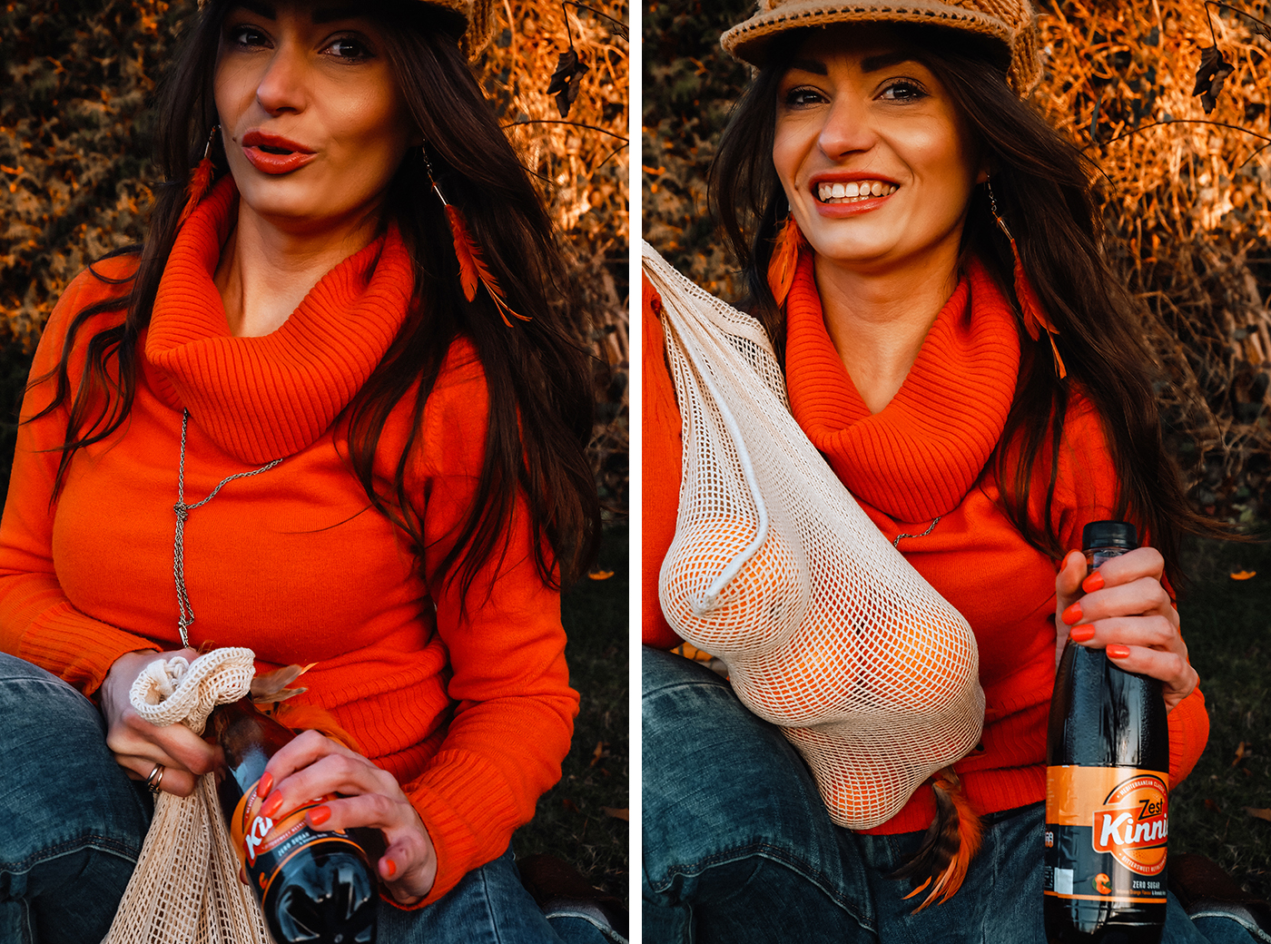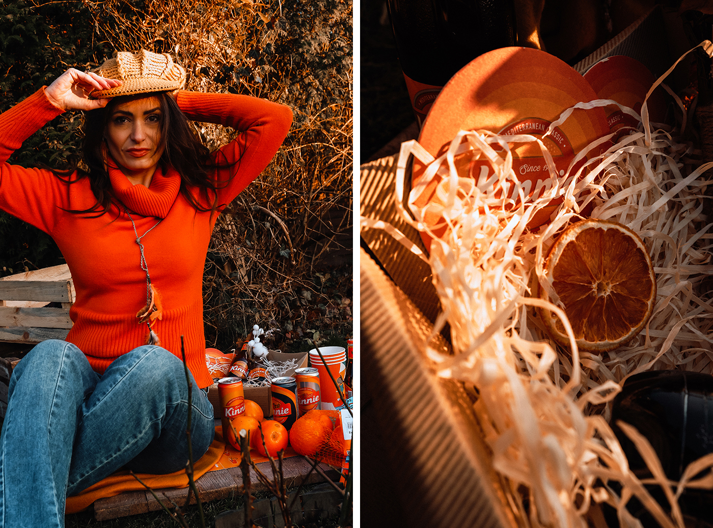 Cała promocja mega mnie natchnęła do wyjścia z domu i zorganizowania plenerowej sesji zdjęciowej z pomarańczowym akcentem w roli głównej. Nie powiem, było to wyzwaniem w drugiej połowie listopada, ale co ma zrobić człowiek pozbawiony balkonu czy jakiegokolwiek podwórkowego obejścia, no ruszyć na działkę. Przeleciał mi przez myśl jeszcze pobliski las, tudzież park, ale wolałam nie ryzykować wścibskich spojrzeń spacerujących Zabrzan lub kuksańca w moją głowę i niepożądaną kradzież sprzętu. Szybki przegląd szafy, pierwszy lepszy pomarańczowy golf na siebie i równie szybkie zakupy w sklepie, co by nie zabrakło pomarańczy:) Zdradzę, że nawet teściowie się zaangażowali i voilà skrzynki do fot stanęły w kadrze niczym na zawołanie. Sprzedawco lokalnego sklepiku dzięki za wypożyczenie, to było brakujące ogniwo do kompozycji:)