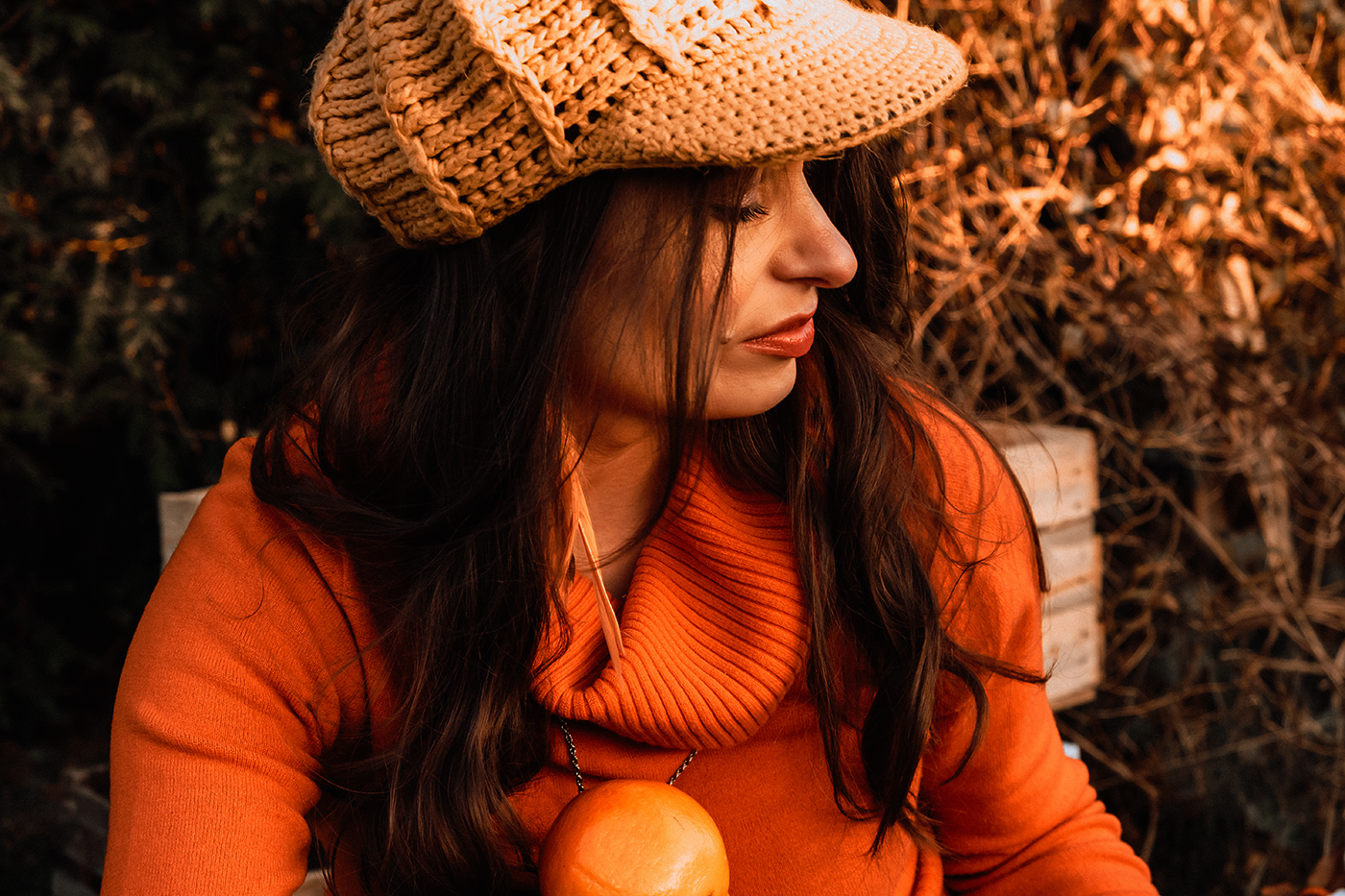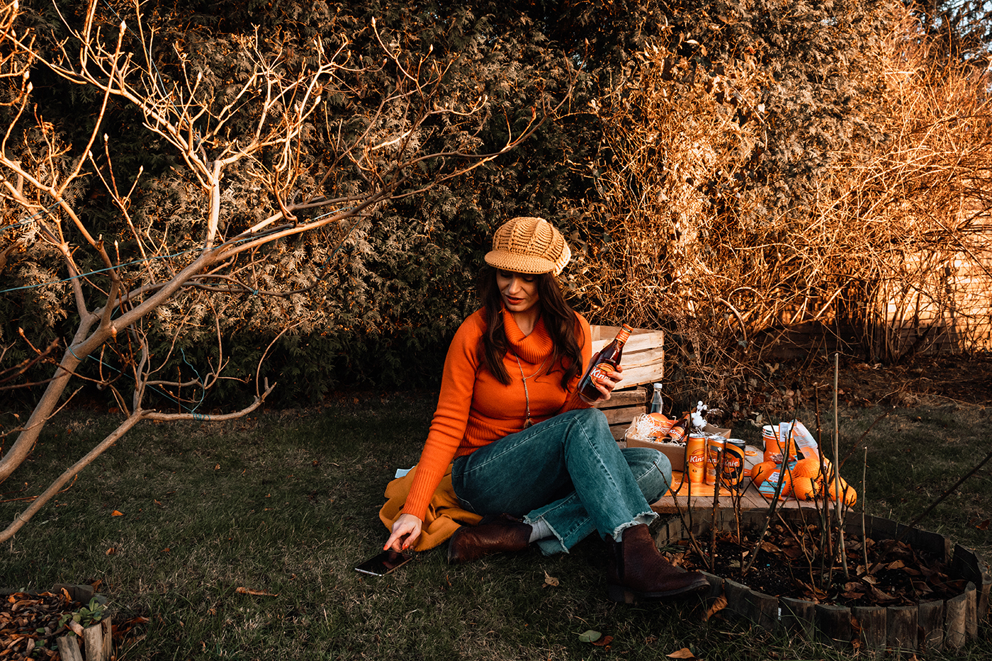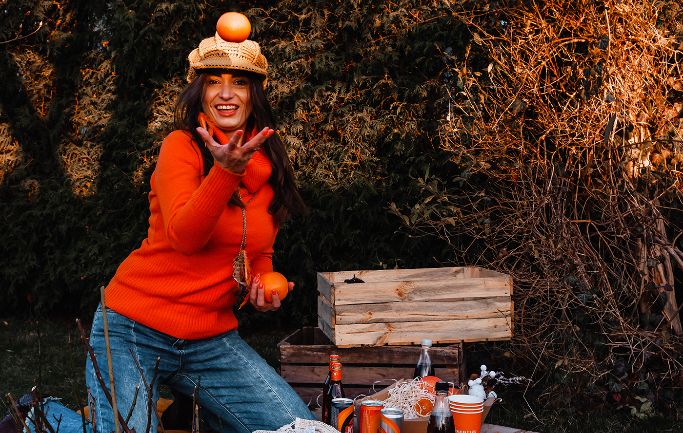 Cała promocja mega mnie natchnęła do wyjścia z domu i zorganizowania plenerowej sesji zdjęciowej z pomarańczowym akcentem w roli głównej. Nie powiem, było to wyzwaniem w drugiej połowie listopada, ale co ma zrobić człowiek pozbawiony balkonu czy jakiegokolwiek podwórkowego obejścia, no ruszyć na działkę. Przeleciał mi przez myśl jeszcze pobliski las, tudzież park, ale wolałam nie ryzykować wścibskich spojrzeń spacerujących Zabrzan lub kuksańca w moją głowę i niepożądaną kradzież sprzętu. Szybki przegląd szafy, pierwszy lepszy pomarańczowy golf na siebie i równie szybkie zakupy w sklepie, co by nie zabrakło pomarańczy:) Zdradzę, że nawet teściowie się zaangażowali i voilà skrzynki do fot stanęły w kadrze niczym na zawołanie. Sprzedawco lokalnego sklepiku dzięki za wypożyczenie, to było brakujące ogniwo do kompozycji:)